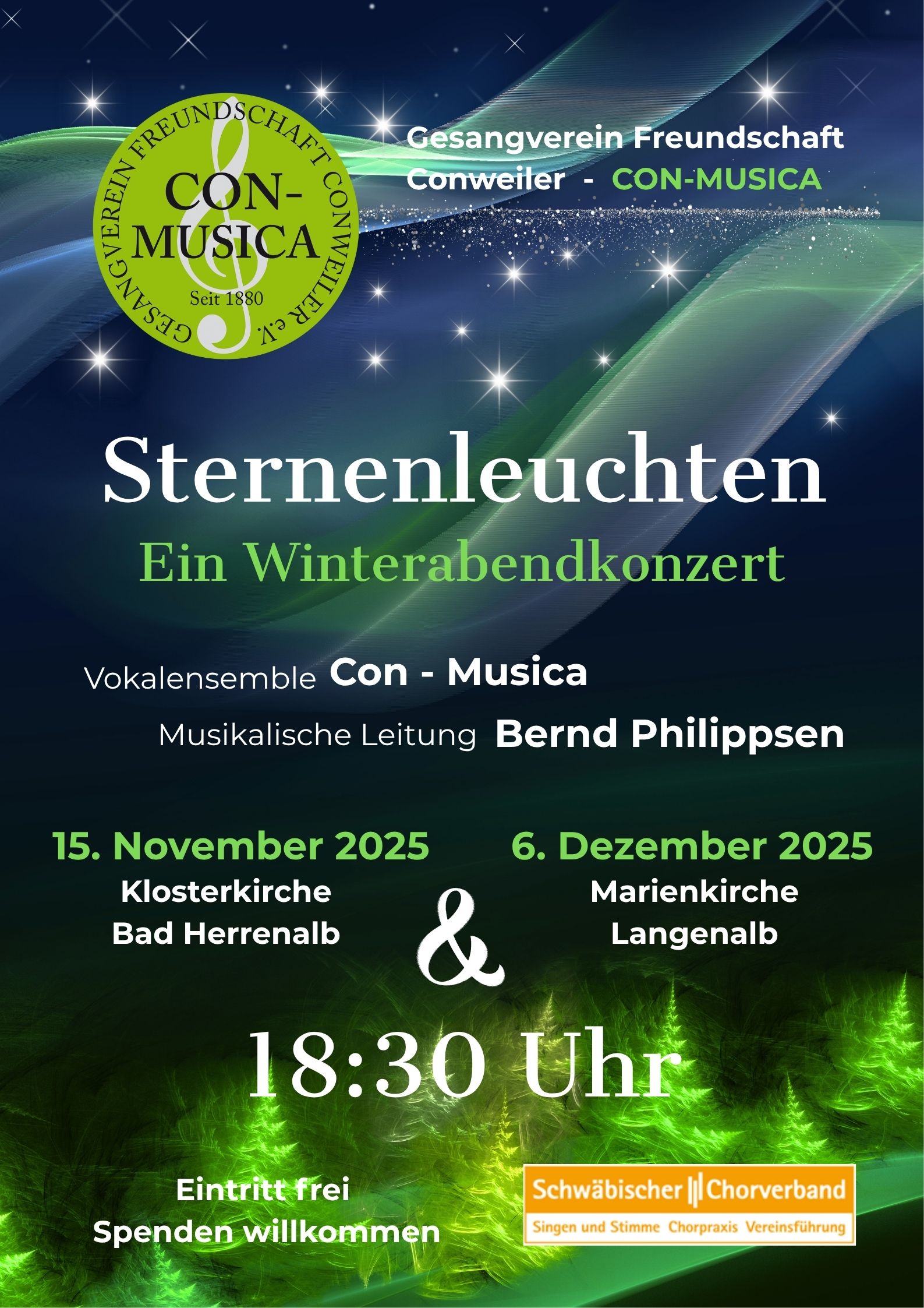 Bald bricht die dunkle Jahreszeit an und wir sehnen uns alle wieder nach Gemütlichkeit, Licht und Behaglichkeit. Lassen Sie sich deshalb von dem Vokalensemble Con-Musica und dem musikalischem Leiter Bernd Philippsen in die warme, „hyggelige“ Welt der schönen Melodien entführen. Wir laden Sie sehr herzlich zu unseren Konzerten „Sternenleuchten“ ein. Wie bei uns üblich, erwartet Sie eine bunte Mischung von Liedern quer durch die Genres der Musikstile. Eines haben alle Lieder gemeinsam, sie werden das Herz wärmen. Besuchen Sie uns am Samstag, den 15. November in der Klosterkirche Bad Herrenalb oder am Nikolaustag in der Marienkirche in Straubenhardt – Langenalb. Beide Konzerte beginnen um 18:30 Uhr und der Eintritt ist frei. Natürlich freut sich der Chor über eine Spende, wenn wir Sie mit unserer Musik erfreuen konnten.